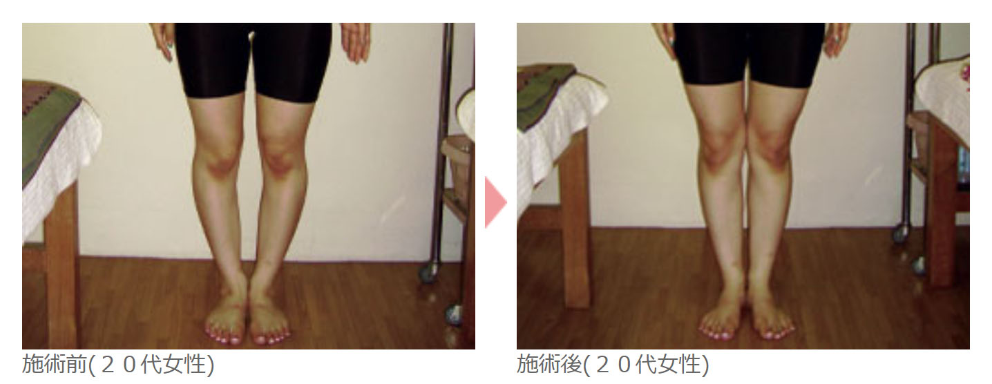 当院の施術は個々の原因を見極め、本来の正しい歩行姿勢で歩行ができるように、歪みを整えてゆきます。単に、膝をつけることだけを目的とせず、上・下半身のバランスを整えていくために背骨・骨盤・股関節なども併せて矯正していきます。これによって腰痛や婦人科系(生理痛など)の改善も図れ、プロポーションも整ってきます。(ヒップ、ウエスト、脚のスリム効果。パンツサイズで1~2サイズ変化します。) また、O脚に多い歩行時のもつれもなくなります。